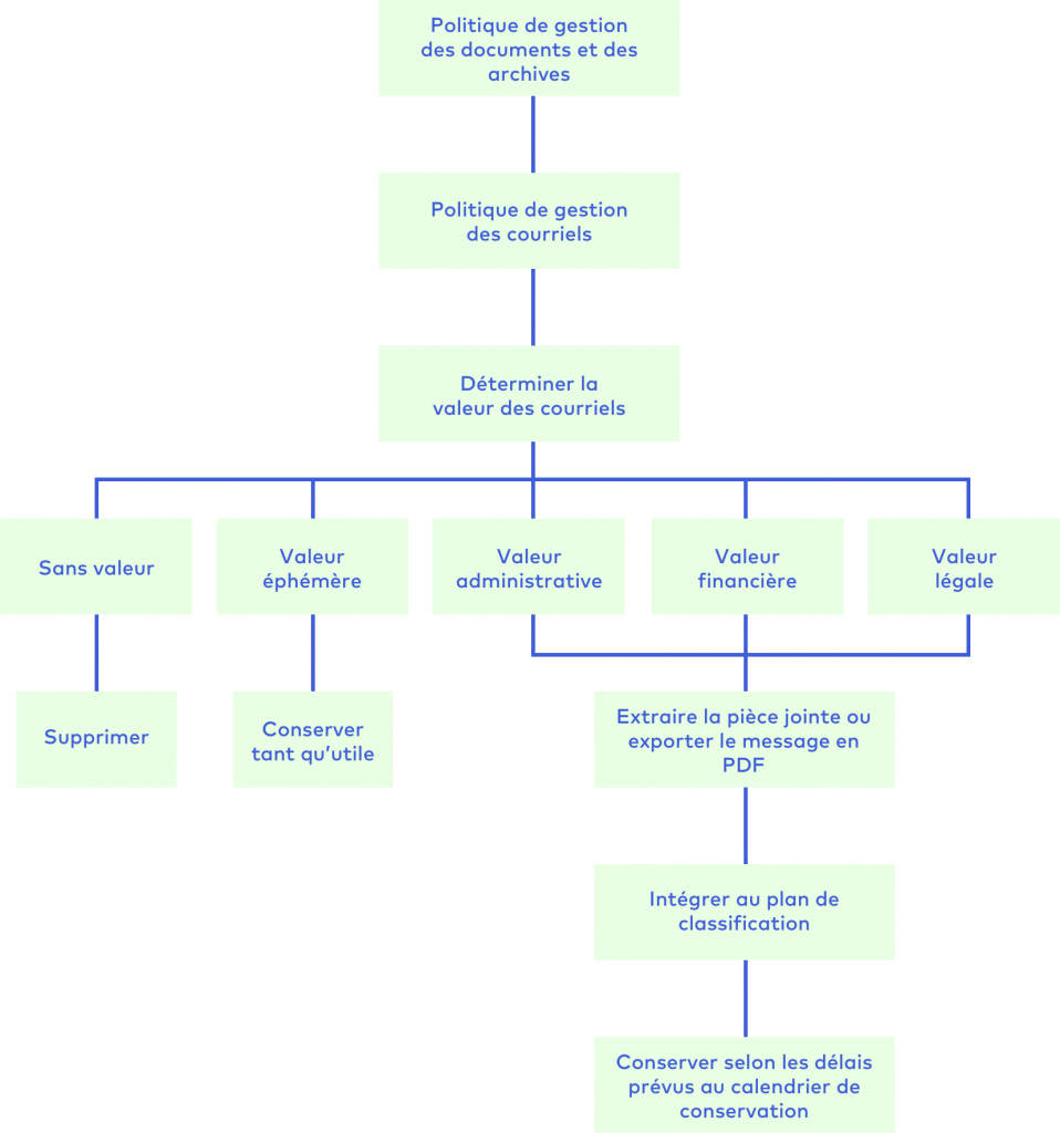 Si votre organisme est doté d’une politique de gestion des documents et des archives, vous pouvez y intégrer des éléments spécifiques à la gestion des courriels, mais il est aussi possible de rédiger une politique spécifique à ceux-ci.